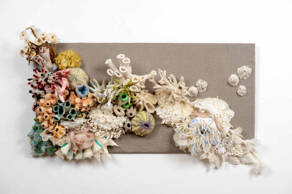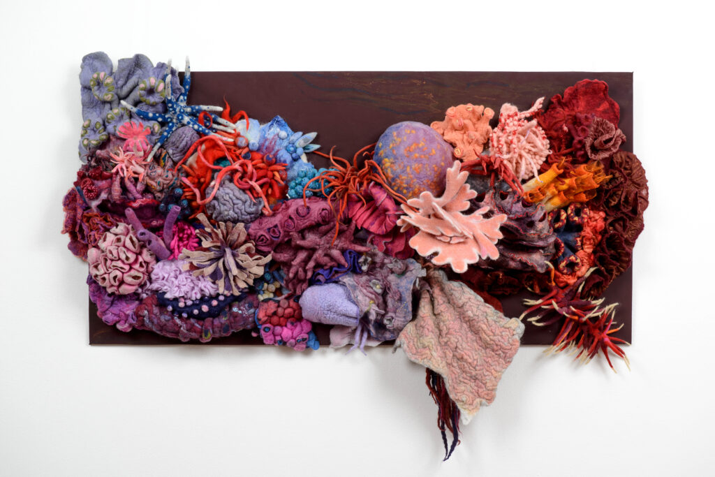 | Koralen Verbinden Vilt op doek en hout, 2021 6 panelen van 120 x 60 cm Idee: Mathilde Pielkenrood Vervaardiging vilten onderdelen: Leden VKG, Nederlandse Viltvereniging Ontwerp en realisatie panelen: Mathilde Pielkenrood, Liesbeth Wieberdink |